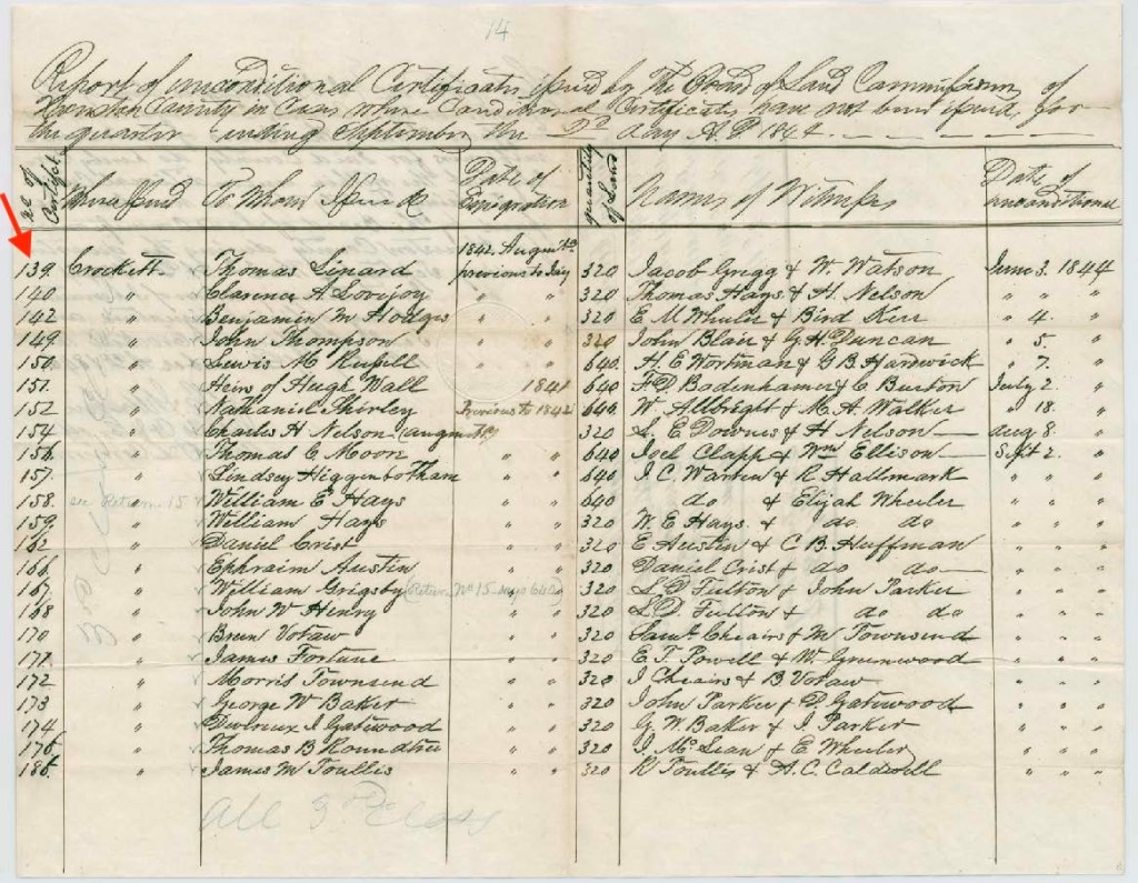 [2] See Texas General Land Office land grant file 1647, patent volume 9, patent number 595, certificate 138, available digitally at the website of Texas GLO. See also Nacogdoches County, Texas, Board of Land Commissioners Records, files 24A-B; and Carolyn R. Ericson, Nacogdoches Headrights 1838-1848 (New Orleans: Polyanthos, 1977), p. 38. The land records show Jacob Gregg and William Watson witnessing Thomas’ application for a land certificate. Both were early settlers of Houston County, Texas, the Greggs arriving there in 1837 from Illinois and settling near the Neches River and San Antonio road.